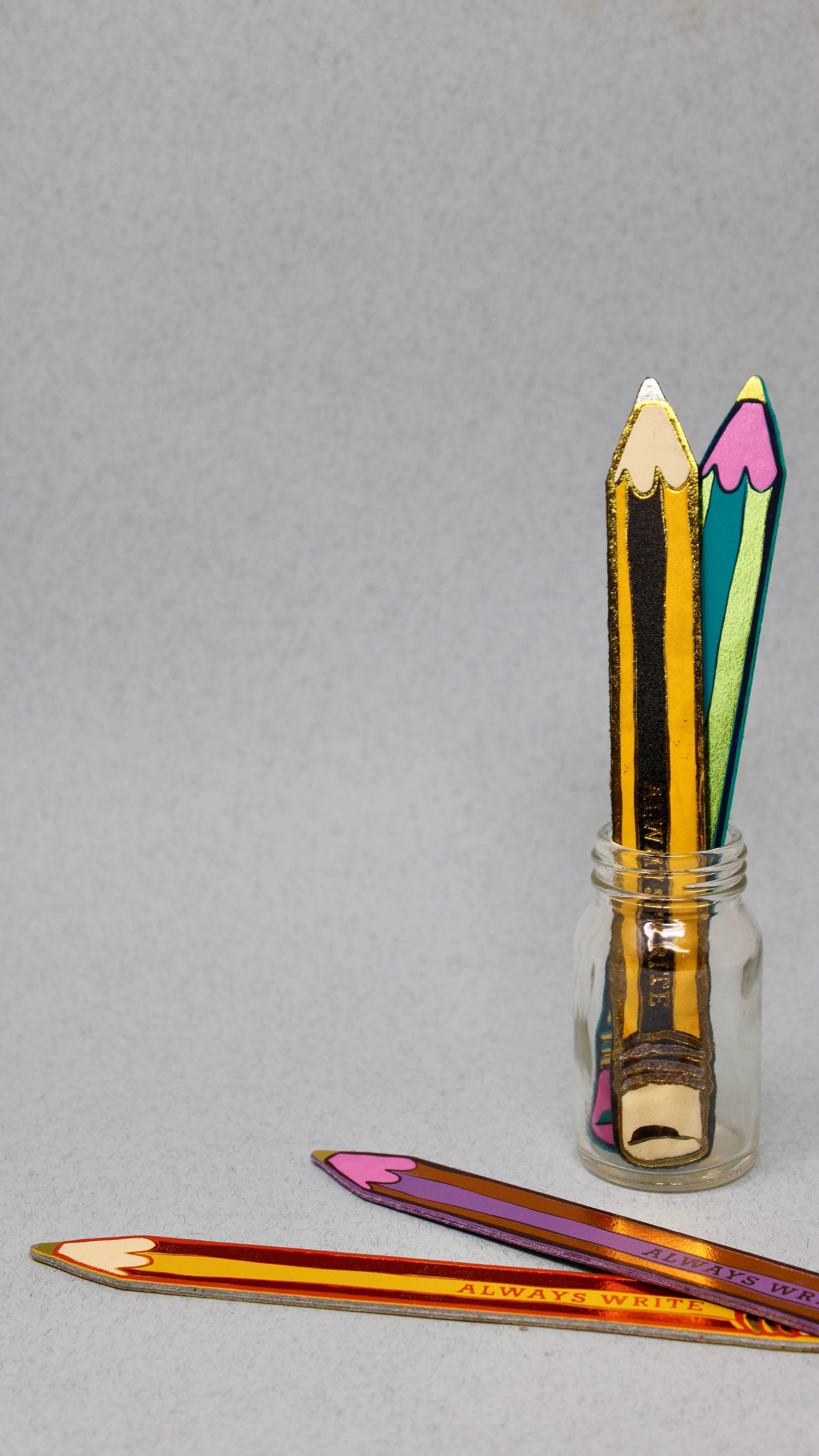 100% Genuine Leather Bookmark | Made in the United Kingdom Always right and always writing! Designed to have a trompe l'oeil effect, this novelty bookmark is a fun gift for budding writers (and those who are always right!). They also make a great back to school present. A brilliant addition for book and stationery stores. 100% genuine leather. Made using the traditional technique of hot foil embossing which ensures a handmade and unique product every time. The genuine leather is sourced from a family run Scottish tannery using skins sourced as a by product from the meat and dairy industry. Embossed and assembled in Scotland. Designed in Ark's Cambridge studio. British made. Height 20cm, about the same size as a HB pencil :)