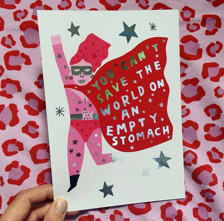 Super shiny silver foil print on recycled silk card to remind you or a pal to look after yourselves and fuel your bodies so you can save the world!