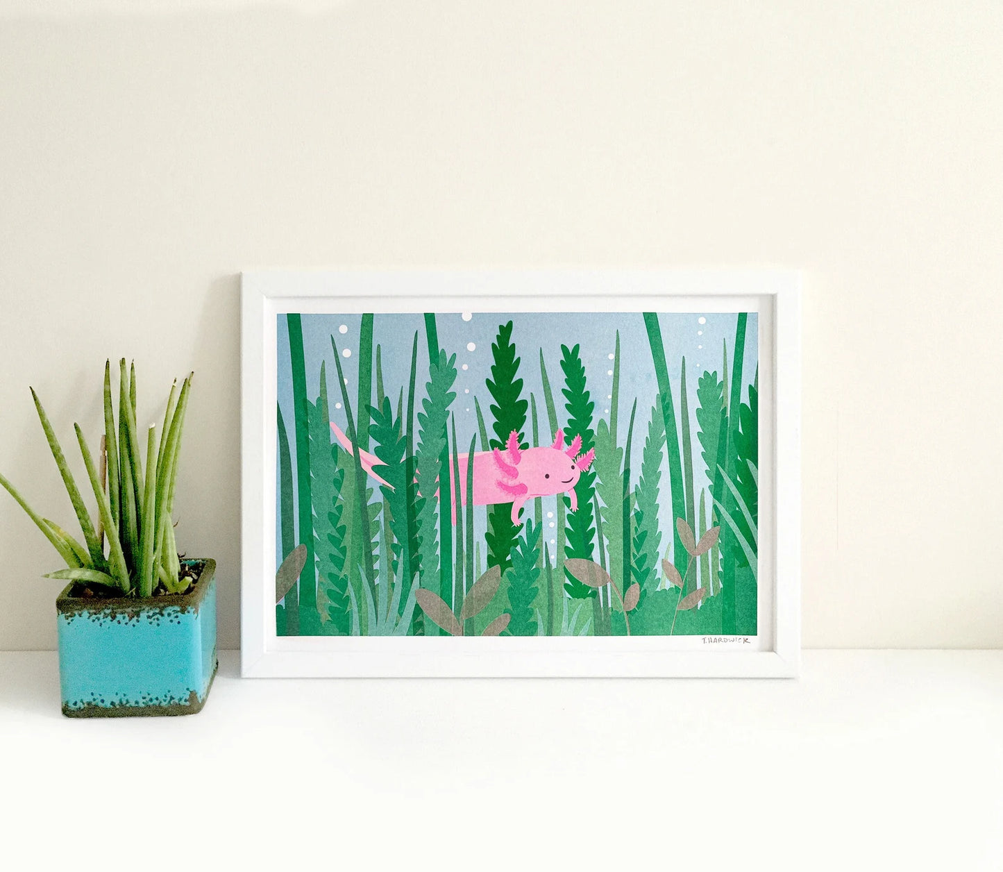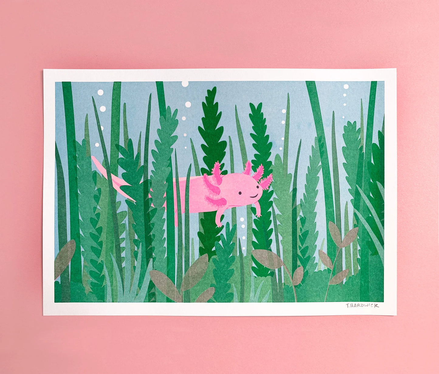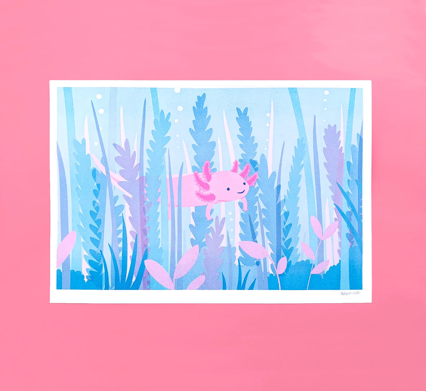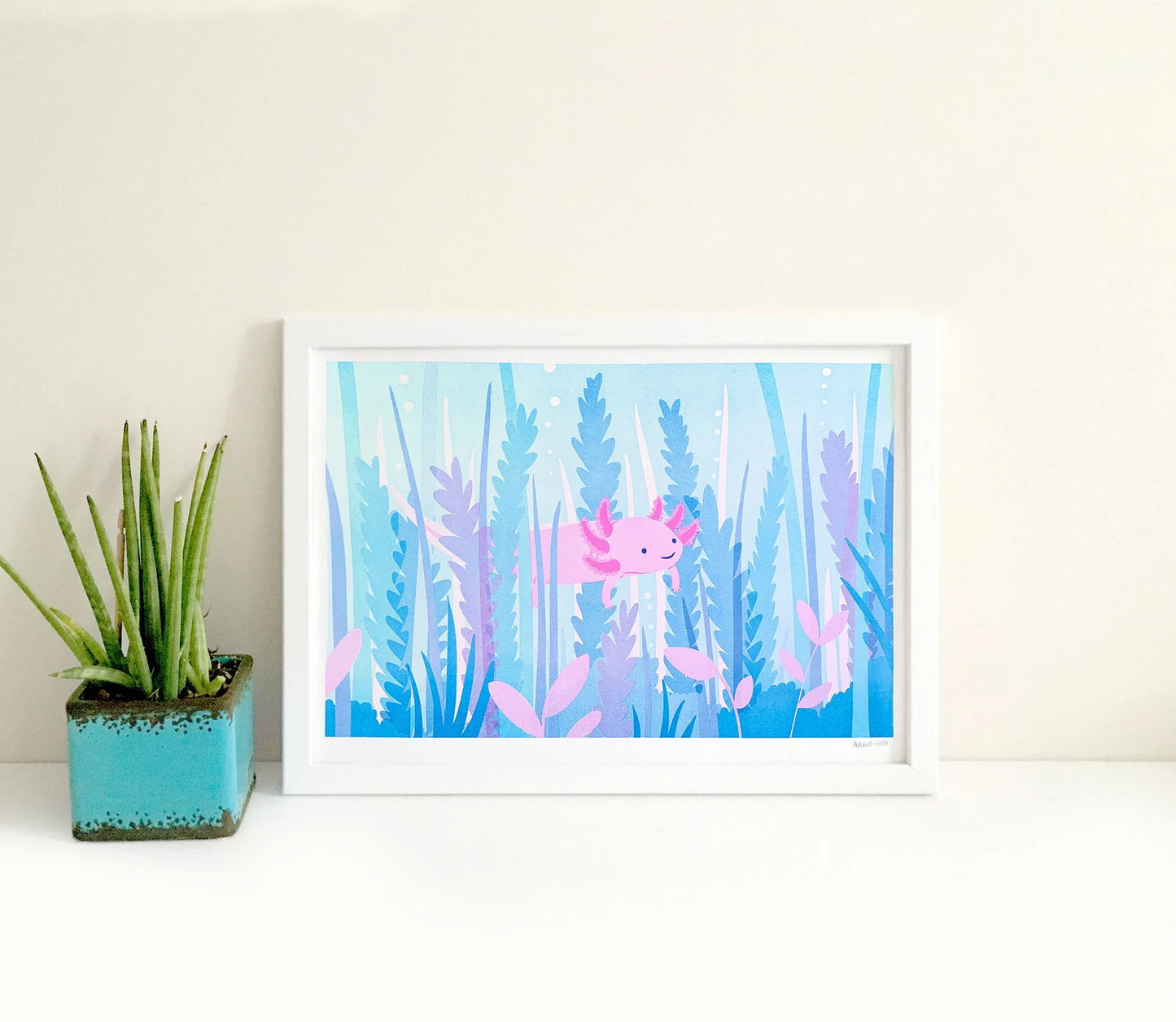 Original illustration of a happy little axolotl. A fun decorative print that would look great around the house or would add a nice cute touch to a children's room or nursery.