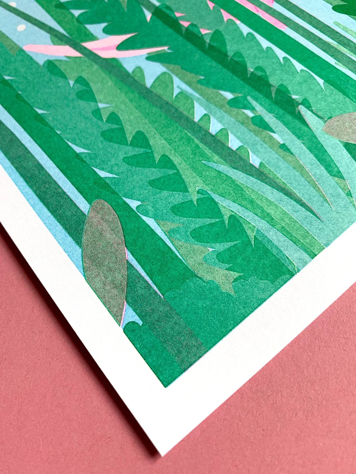 Risograph printing is an environmentally friendly, high quality form of printing that is like a cross between photocopying and silk screen printing. Like with screen printing, you can use similar methods of layering and overlapping to create multi-coloured images.