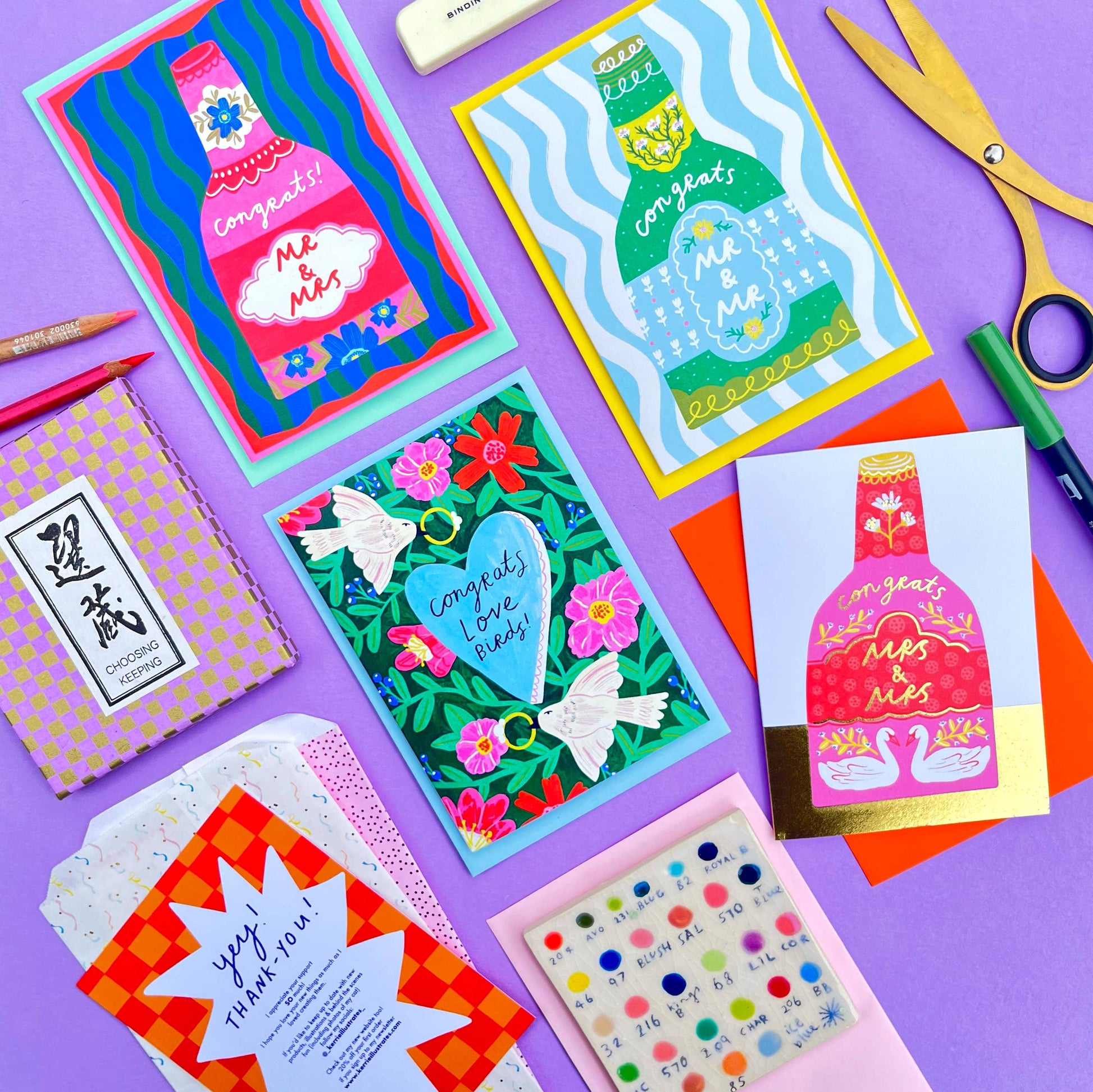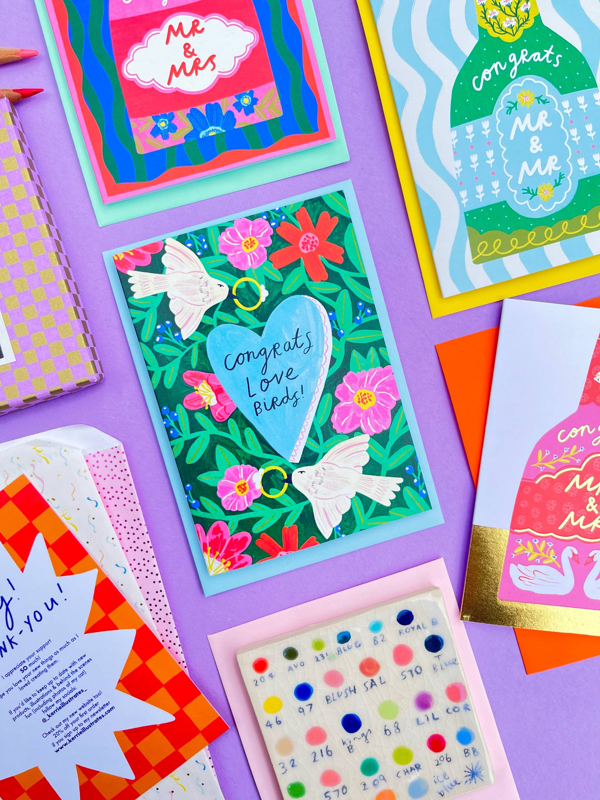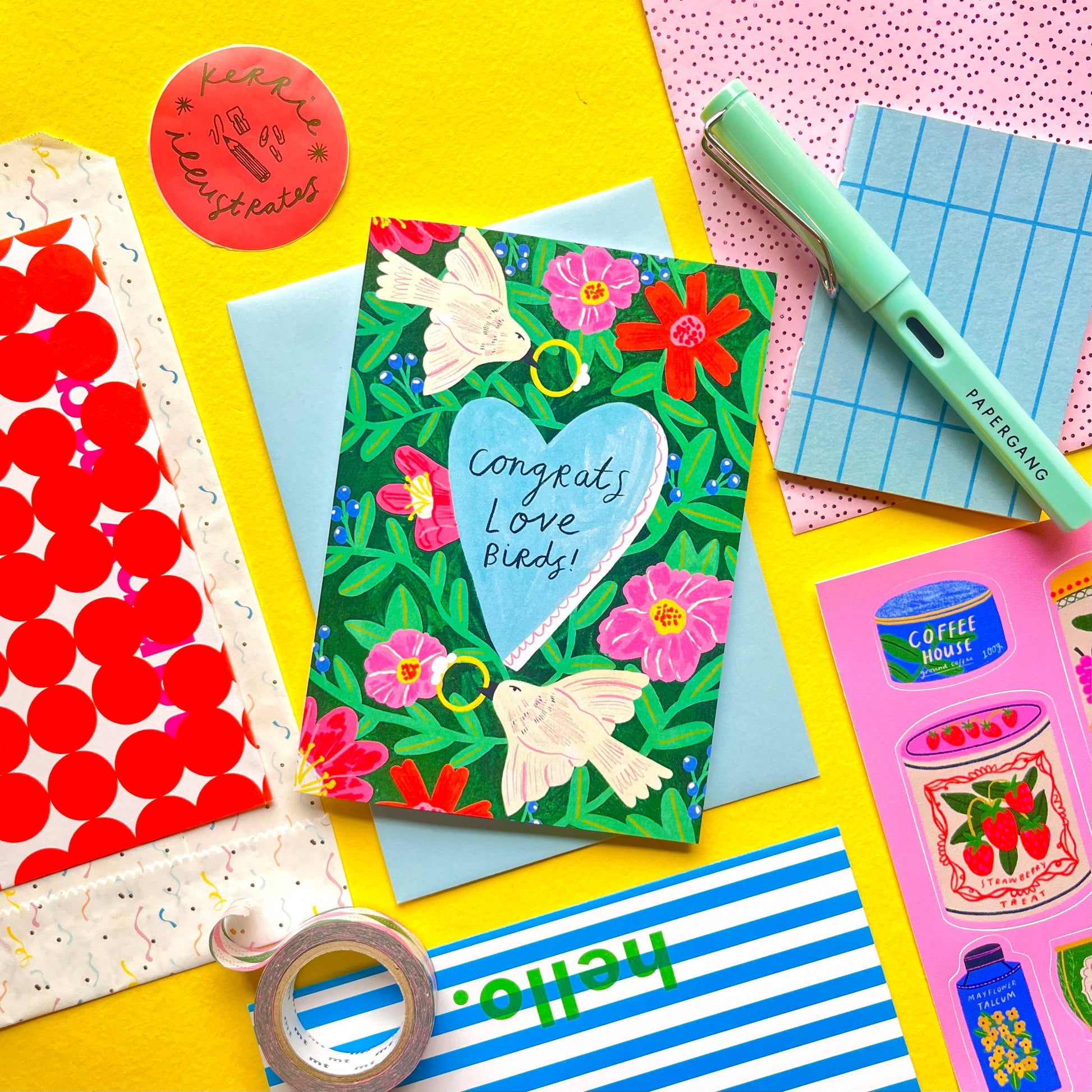 Has your favourite couple finally tied the knot? Send some love their way and share in their excitement! This colourful greetings card features two little love birds, an engagement ring and a beautiful floral pattern, reading 'Congrats, love birds!' inside a blue heart. This card is A6 and is printed on 350gsm uncoated sustainable card stock. It is paired with a bright envelope! As well as this card, we have other beautifully illustrated cards for weddings and engagement. If you’re looking for cards for everyone, bold designs and cards that will stand out.. you’ve came to the right place! All the designs are illustrated with love by Kerrie, an illustrator based in Northern Ireland. Kerrie creates cute illustrations inspired by bright colours, patterns and spreading positive vibes. Details: • congrats love birds card • A6 portrait card • sustainable card • designed & printed in the UK