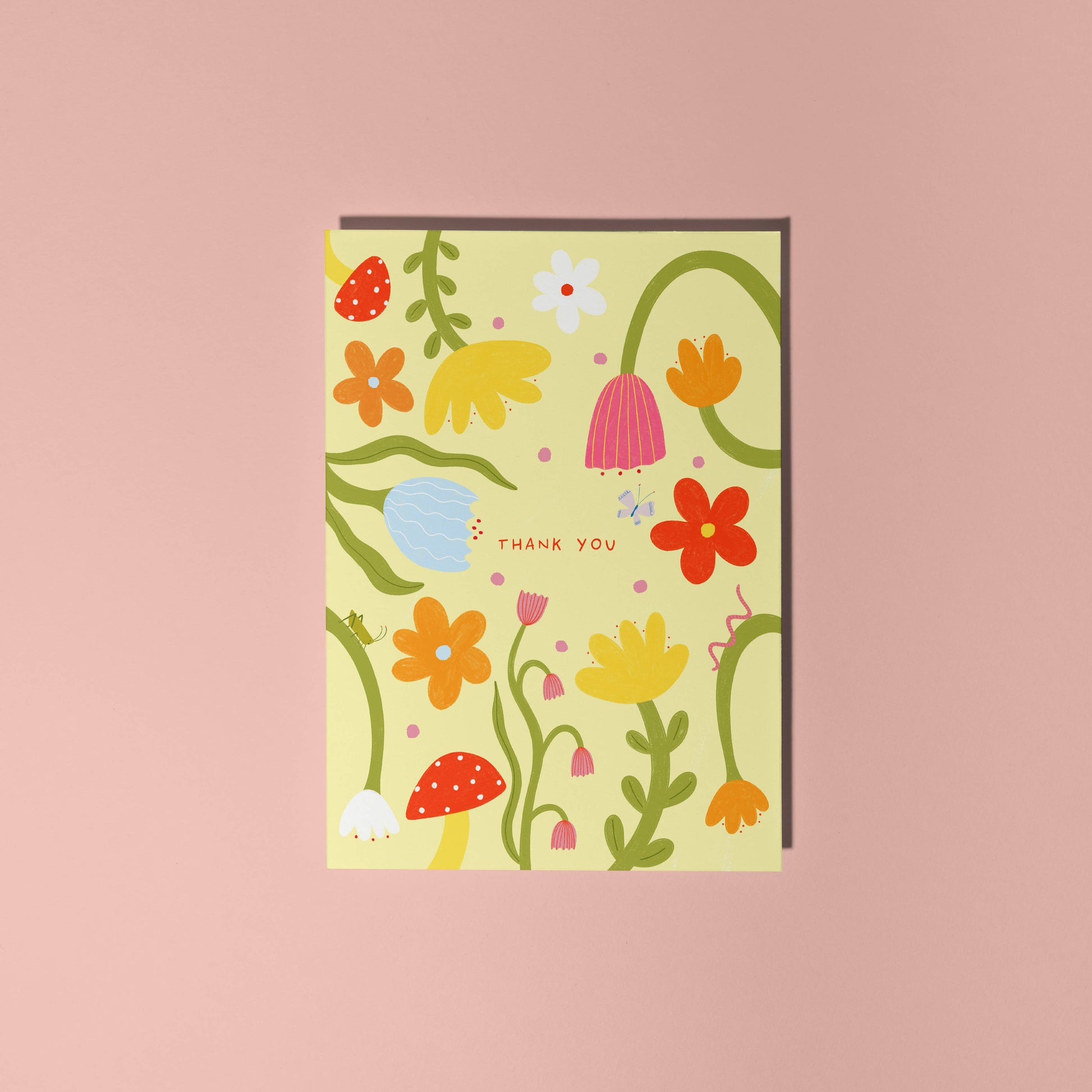 A simple, colourful way to send thanks to a friend, neighbour, colleague or family member. This illustrated card features folky contemporary coloured flowers and mushrooms. Thank You Card Features: - Supplied with a kraft envelope - Size: 105mm x 150mm (A6) - Blank inside - 100% Recyclable, 300gsm uncoated luxury card stock - Illustrated in Manchester and printed in the UK - Packaged with biodegradable cello by default. These greeting cards are illustrated by Sarah Wilson for Little Black Cat Illustrated Goods, a UK based brand. The designs showcase the brand's playful style , which is can be seen throughout their collection of unique greeting cards and art prints.
