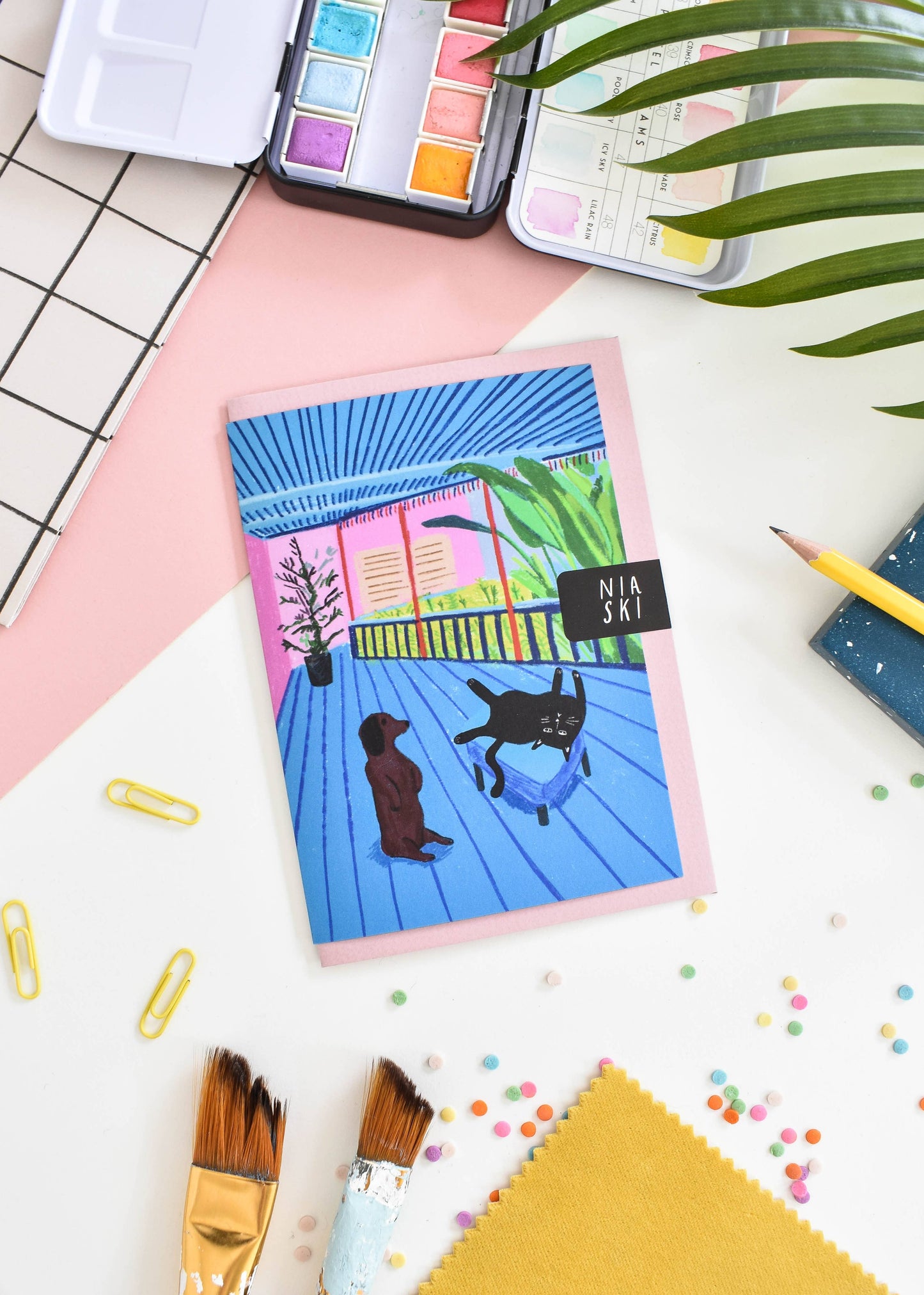 The 'Cats in Art' card is a feline interpretation of Pop Artist, David Hockney's 'TInterior with Blue Terrace and Garden', now reimagined with a dog and cat. Combining a love of cats and a passion for art, illustrator and designer Nia Gould (‘Niaski’) has created a punny card range celebrating the life and times of artistic felines.