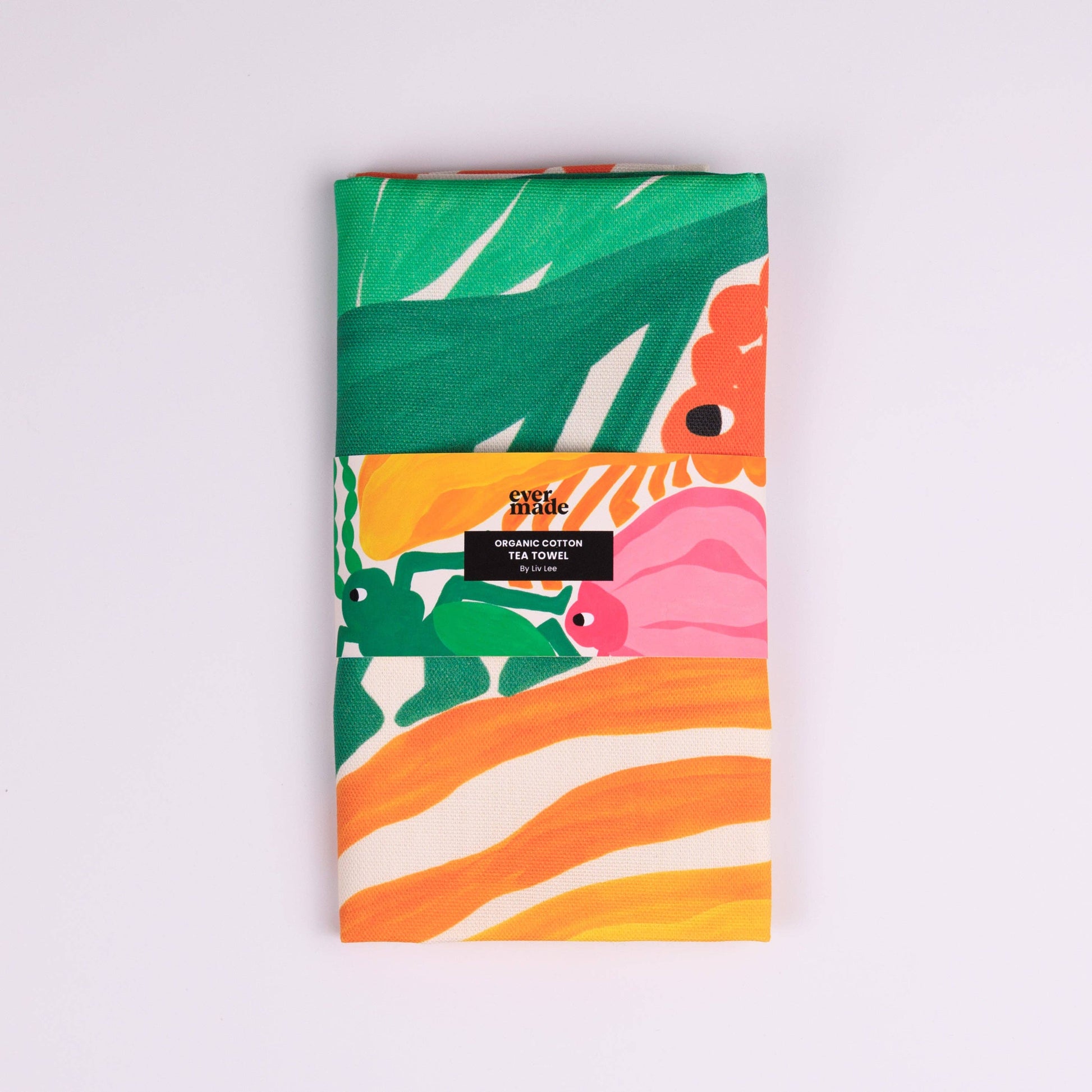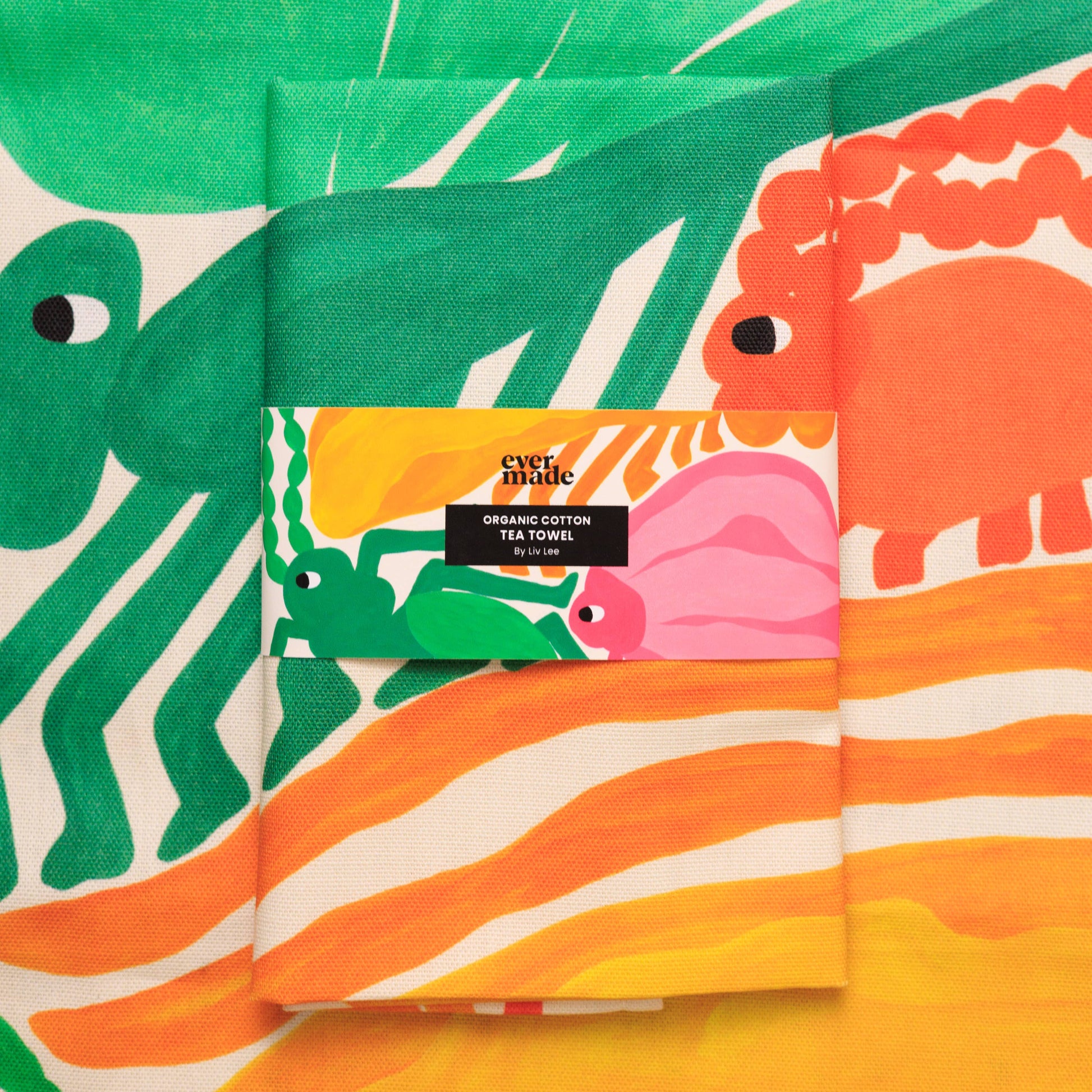 Illustrated by Australia-based artist Liv Lee, this tea towel features fun, colourful insect characters with simple graphic detail. The design is inspired by the rewilding of the UK and the everyday beauty found in nature closer to home.