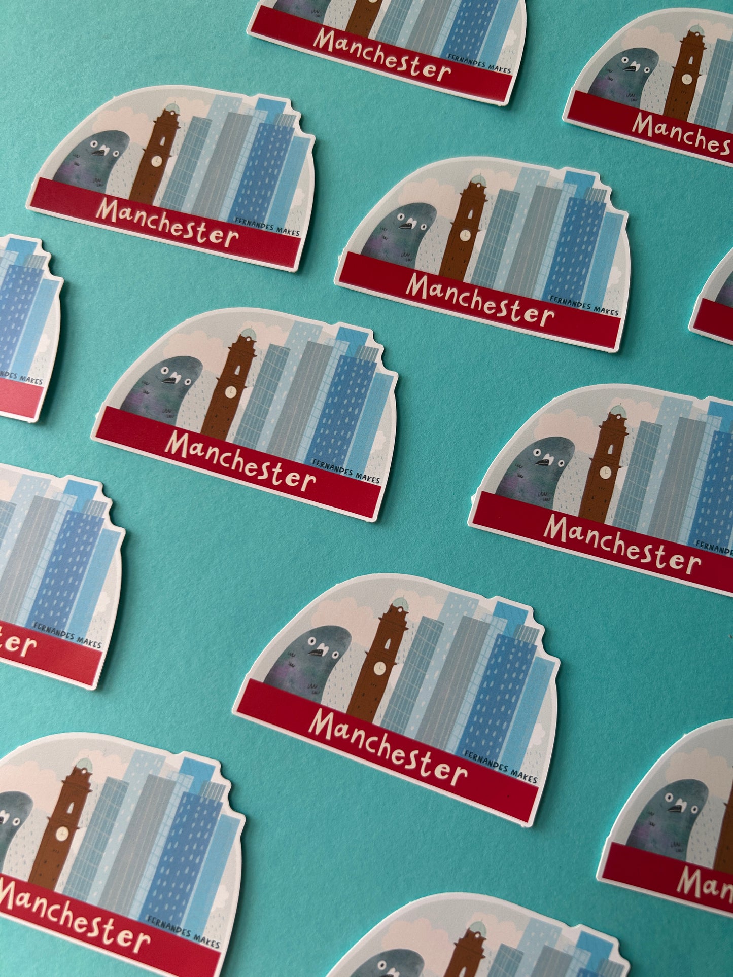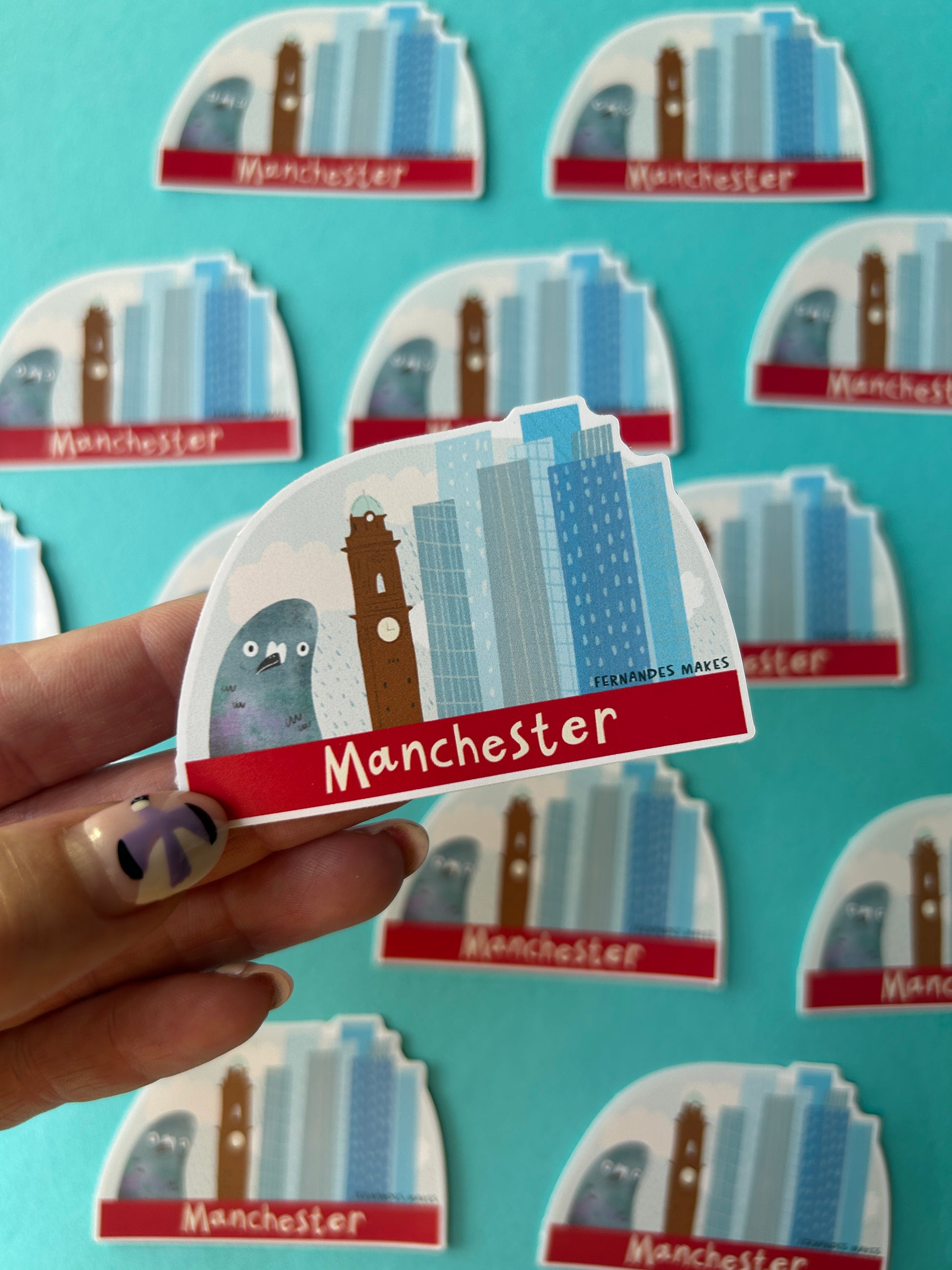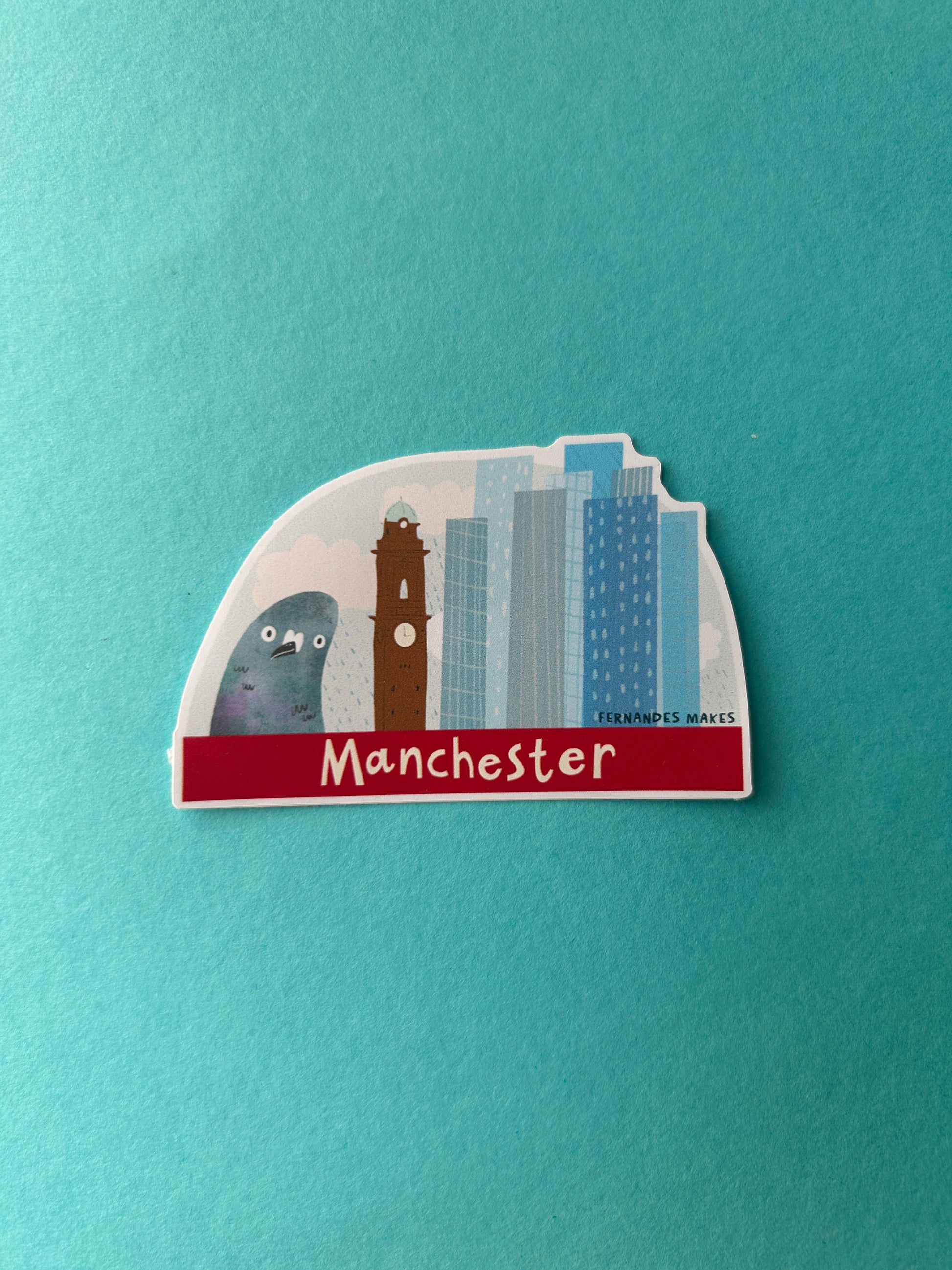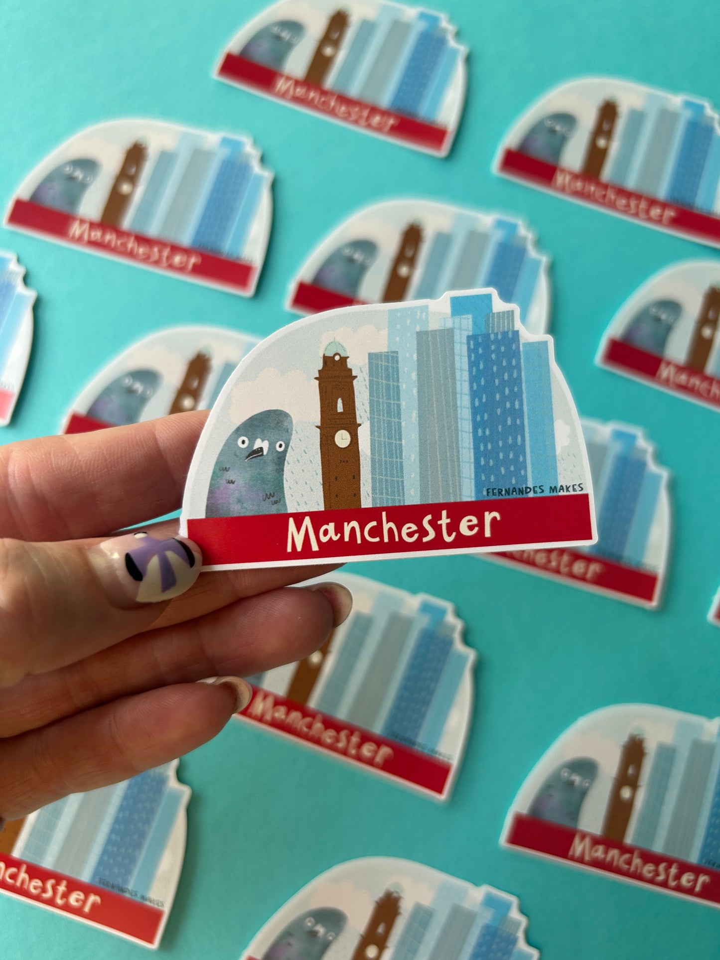 Quirky Manchester skyline sticker featuring Kimpton Clock Tower and a pesky pigeon!
