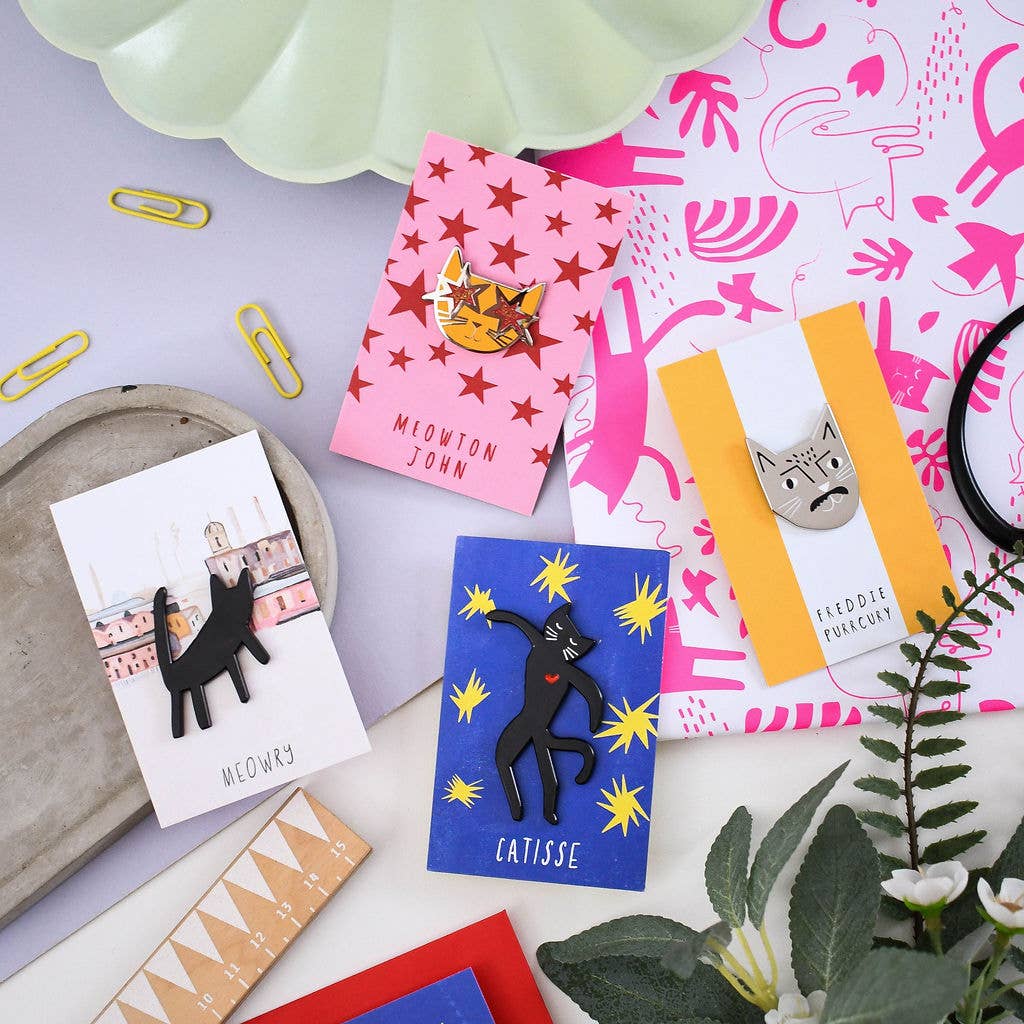 Illustrator Nia Gould brings together her love of cats and art in a unique accessories range. Introducing the purr-fect accessory for all feline and art enthusiasts - The ‘Cat Artist’ enamel pin range is a feline reimagining of some of the greatest artists of all time. Adorn your favourite jacket, tote bag, or backpack with this adorable and eye-catching pin that combines two passions in one. Crafted with meticulous attention to detail, this miniature work of art features a charming cat with an artistic twist on the original works of art or artist. The ‘Meowry’ is a feline interpretation of Art legend, L.S Lowry now reimagined as ‘Meowry.’ Whether you're treating yourself or searching for the purr-fect gift for a fellow cat lover or artist, this art-themed cat pin badge is guaranteed to bring a smile to anyone's face. It's a small but meaningful way to express your love for the feline world and the magical realm of art.