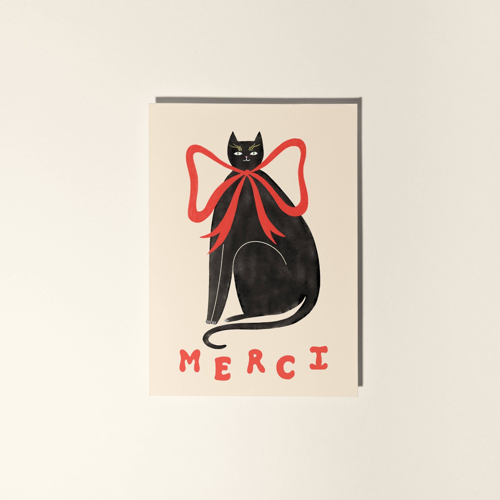 This cute thank you card features a stylish black cat with a big red bow. Red retro text reads 'Merci'.