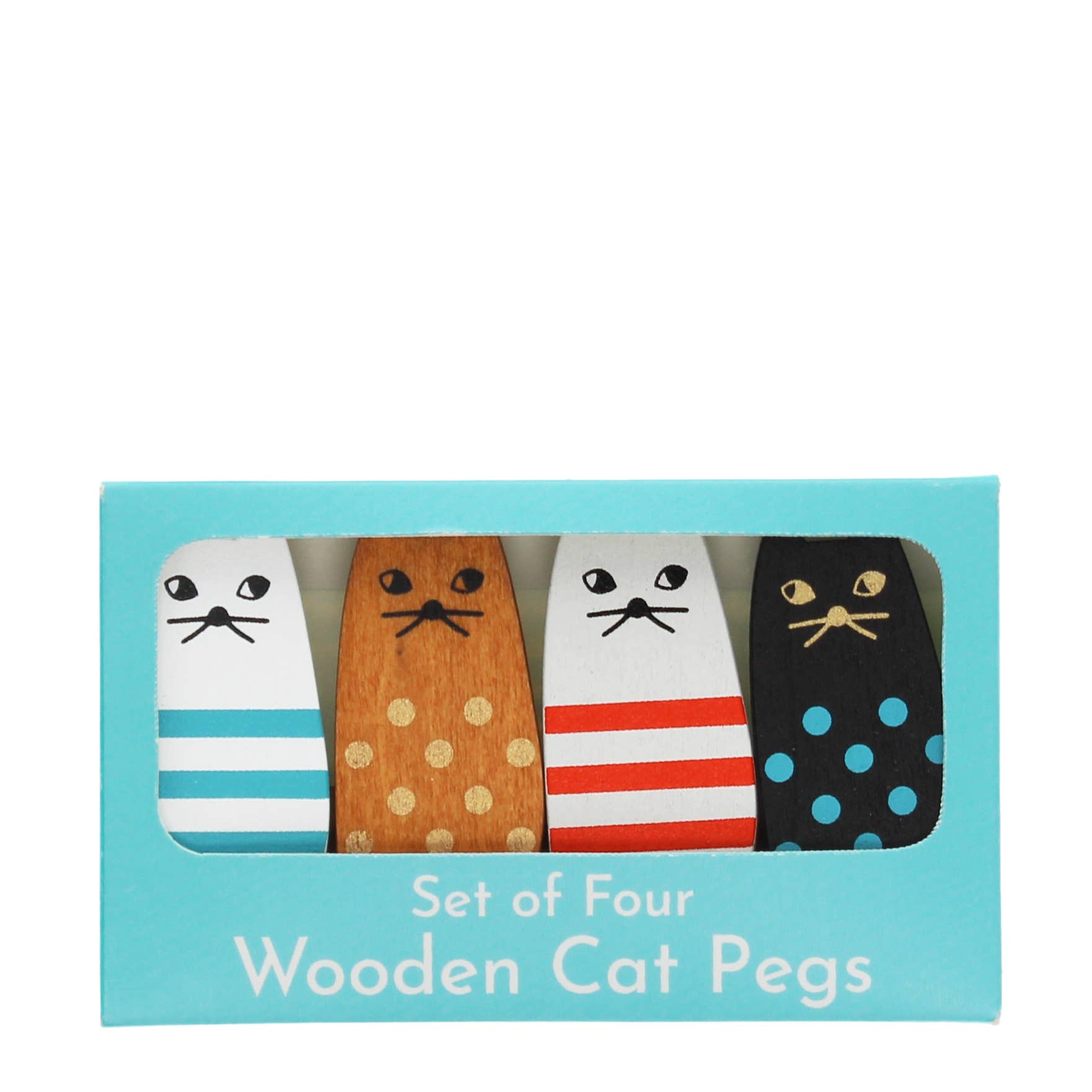 Set of four mini decorative wooden pegs, featuring cute cats in assorted colours and patterns, including stripes and spots. Perfect for use as note or photo clips to decorate a cat lover's home.