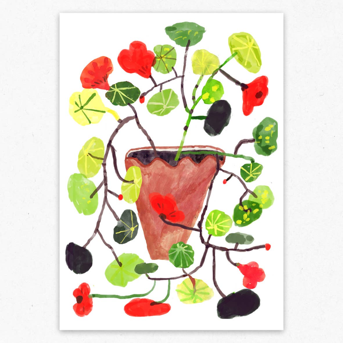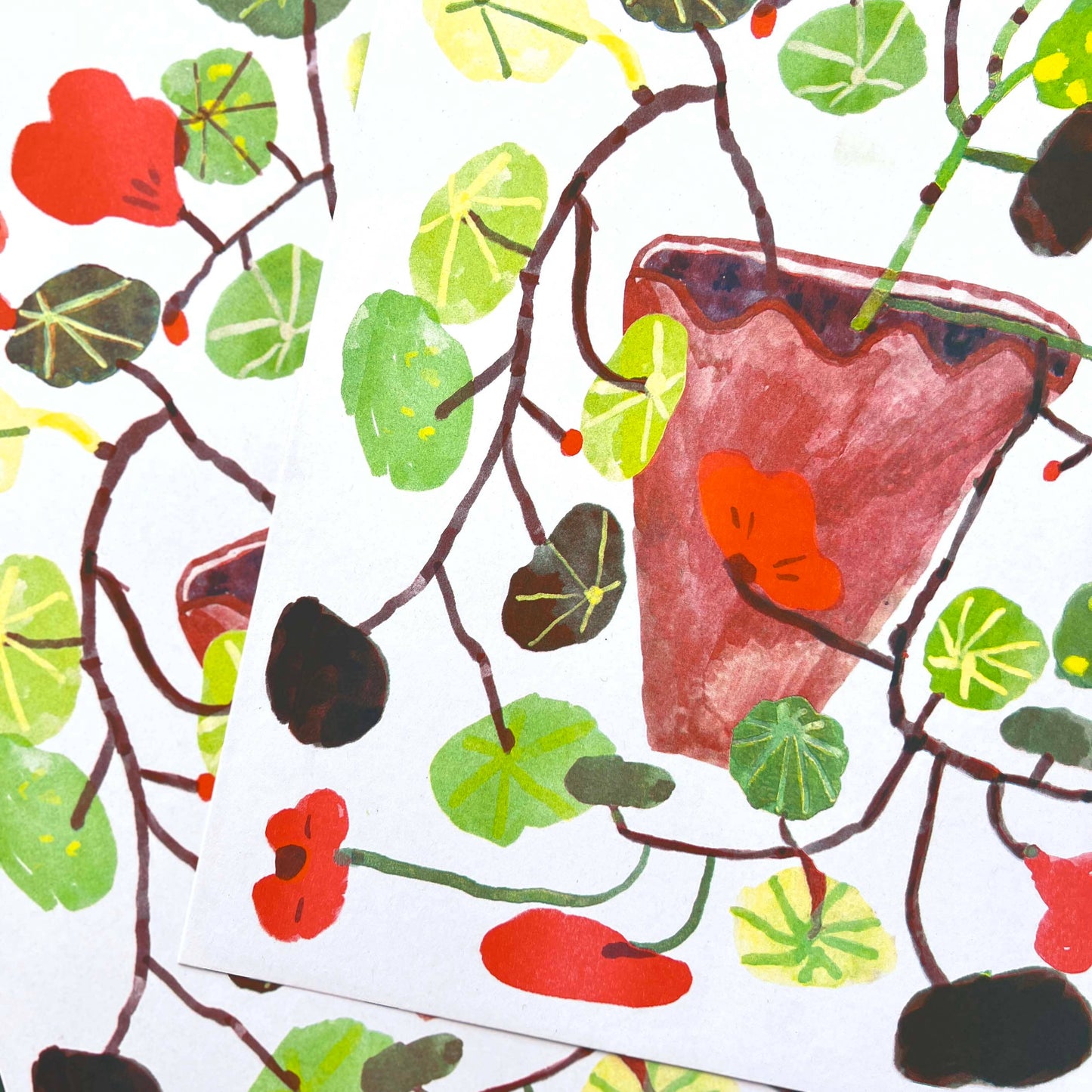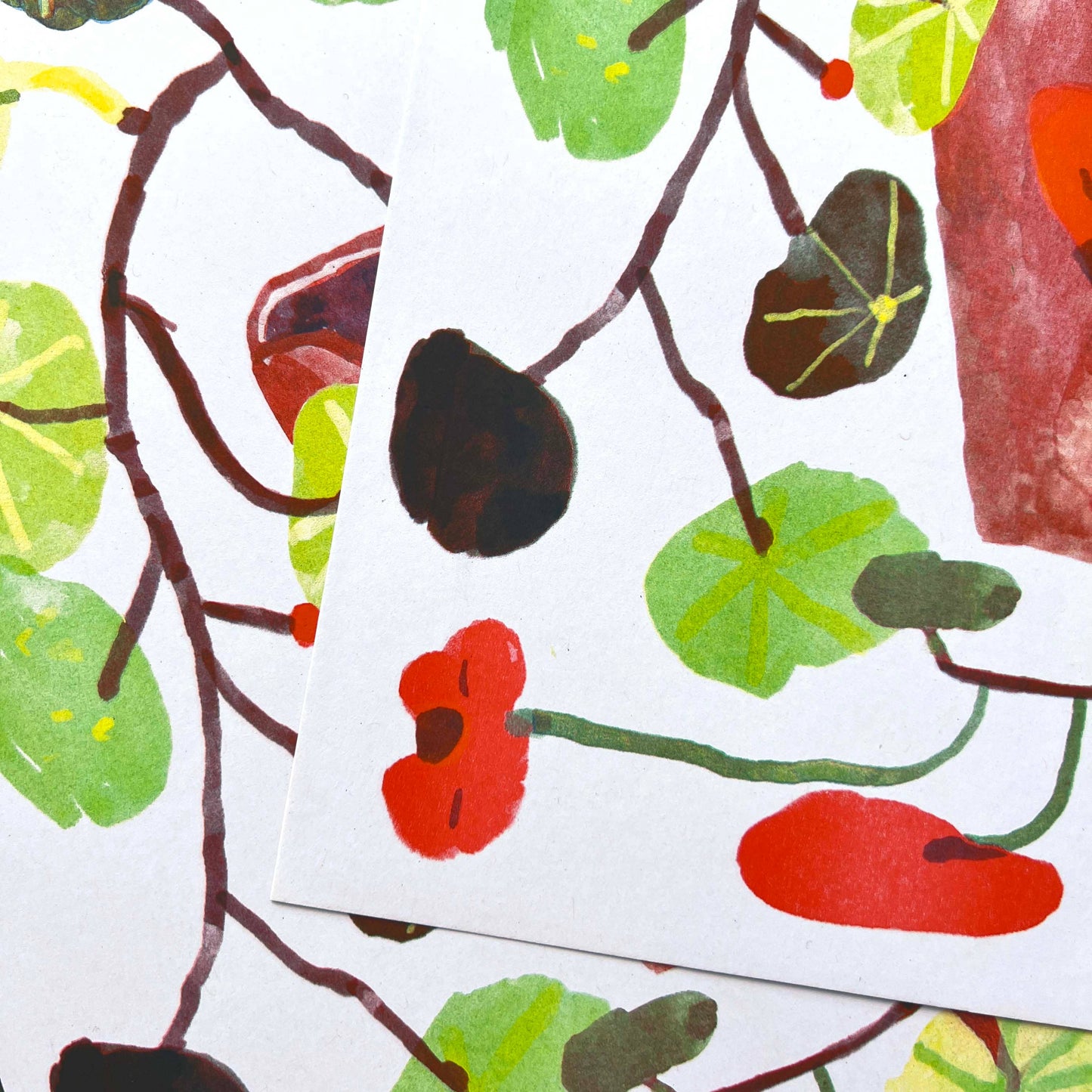 A3 Nasturtium Print. This 4 color Risograph print has a beautifully tactile quality and a vibrant finish. Every print is Risograph printed in our Glasgow studio onto thick recycled paper using eco-friendly plant-based inks. The printing process means each print will vary slightly, which is part of the magic of riso-printing! This print is 29.7 x 42cm on 250gsm off-white paper. Prints are delivered flat in a protective bio-degradable cello wrap with a grey backing board. Illustrated by Rachel Cannings.