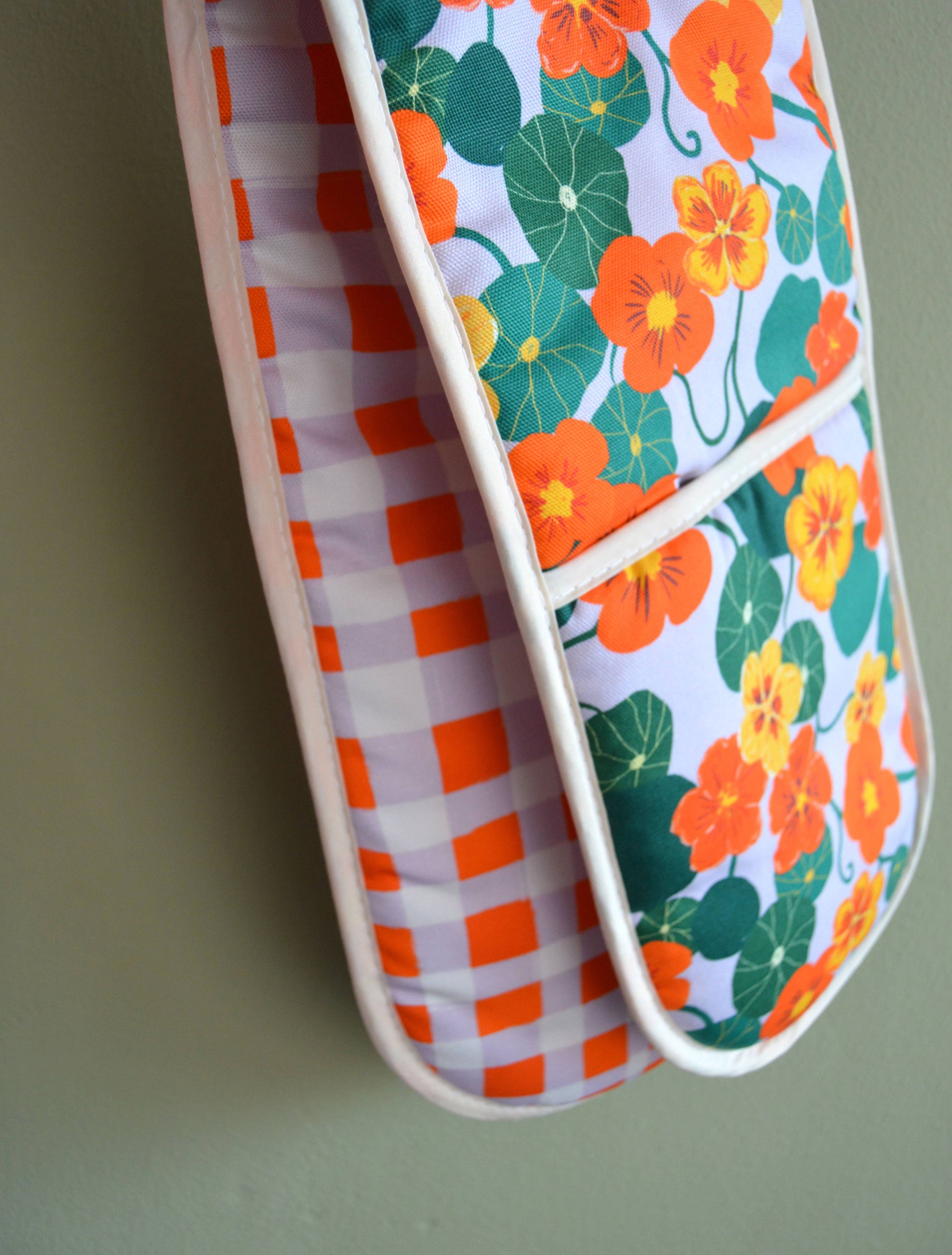 The gloves have the Nasturtiums print on the front and complimentary check pattern on the reverse with natural coloured binding and hanging loop. The gloves measure 96cm x 20cm.