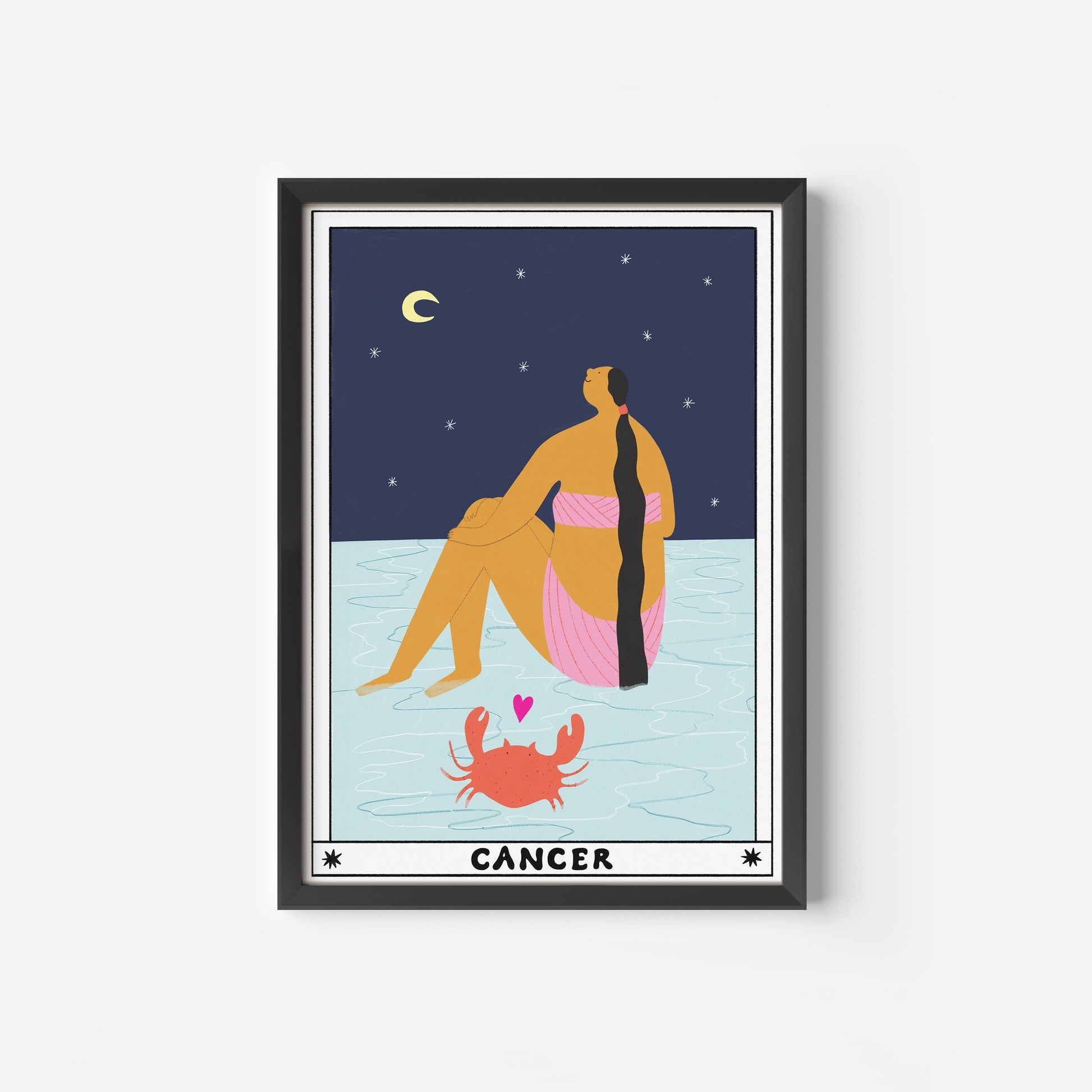 Contemporary print design for the Cancer Zodiac sign. Featuring a lady sitting in the ocean looking at the moon. The Zodiac collection features all 12 Horoscope Signs designed like a tarot card with a celestial aura. Please note, this listing is an art print. Art Print Features: - Frame not included - 315GSM, 100% cotton paper - High quality Giclée printed using pigment based ink - Packaged flat with greyboard backing in compostable cello sleeve - Designed and printed in our Manchester, UK studio - Packaging and paper sourced from UK suppliers - Easy to frame standard sizes These art prints are illustrated by Sarah Wilson for Little Black Cat Illustrated Goods, a UK based brand. The designs showcase the brand’s playful artwork style, which can be seen throughout their collection.