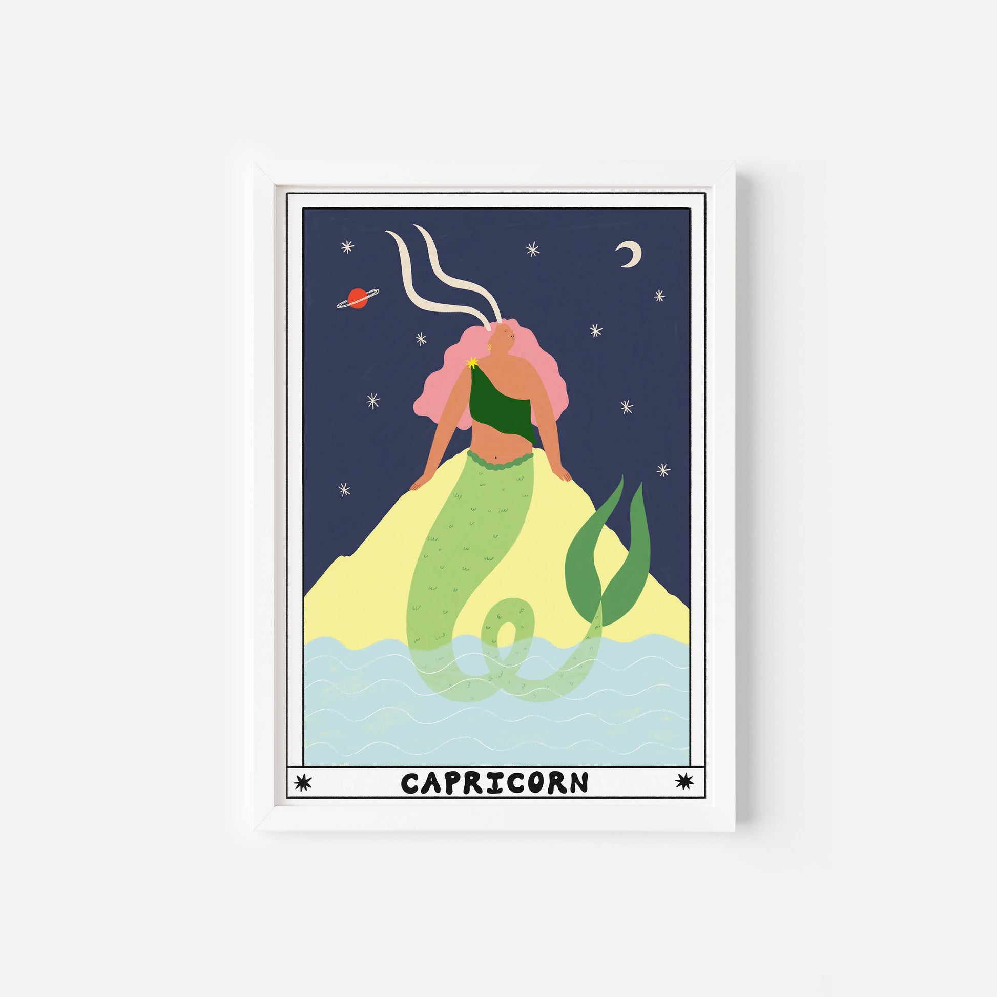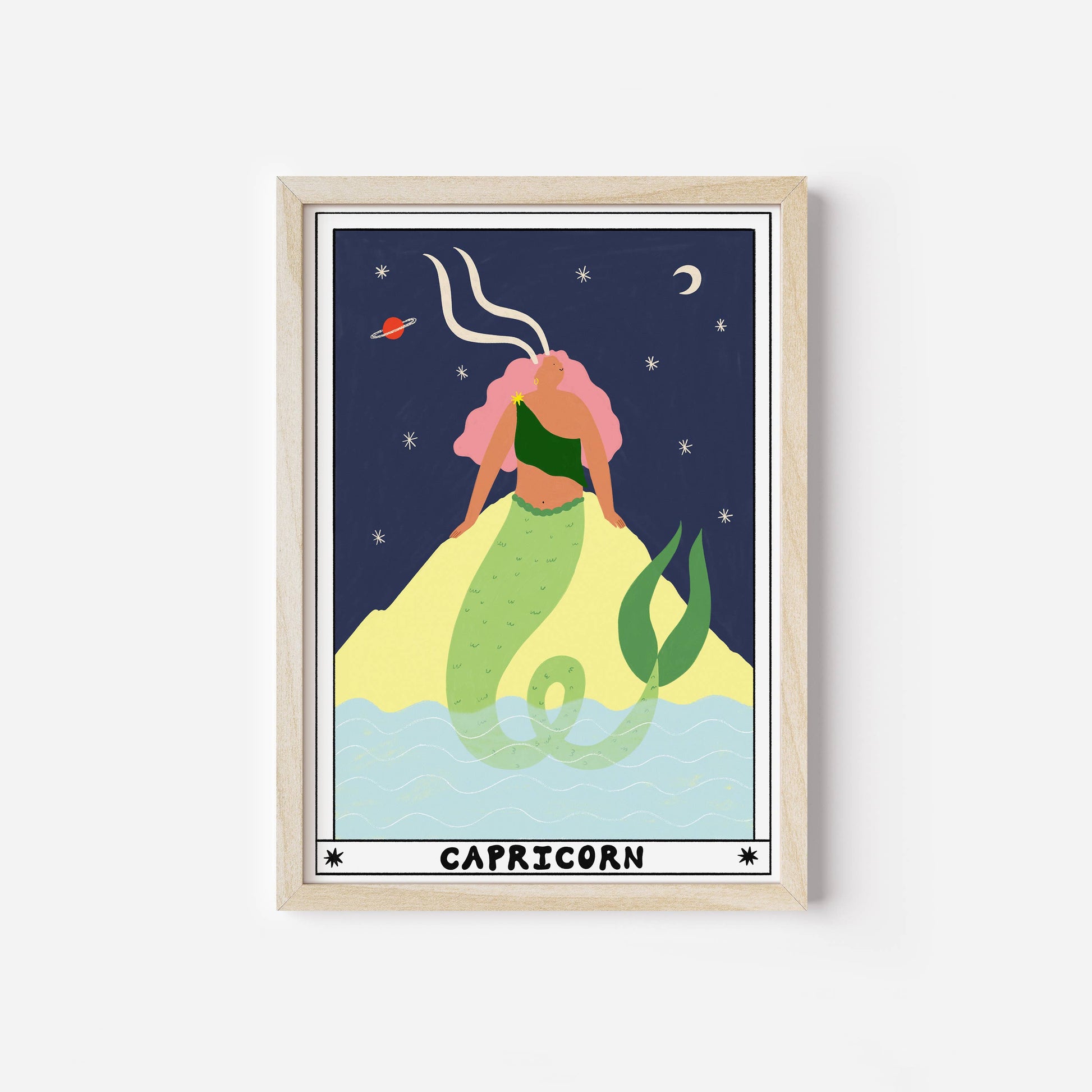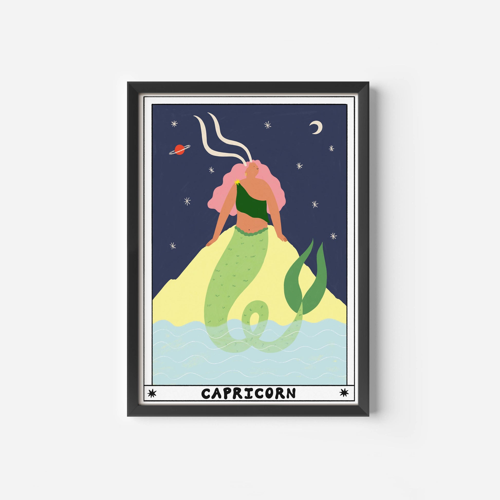 Contemporary print design for the Capricorn Zodiac sign. Featuring a horned, mermaid tailed lady sitting on a rock. The Zodiac collection features all 12 Horoscope Signs designed like a tarot card with a celestial aura. Please note, this listing is an art print. Art Print Features: - Frame not included - 315GSM, 100% cotton paper - High quality Giclée printed using pigment based ink - Packaged flat with greyboard backing in compostable cello sleeve - Designed and printed in our Manchester, UK studio - Packaging and paper sourced from UK suppliers - Easy to frame standard sizes These art prints are illustrated by Sarah Wilson for Little Black Cat Illustrated Goods, a UK based brand. The designs showcase the brand’s playful artwork style, which can be seen throughout their collection.