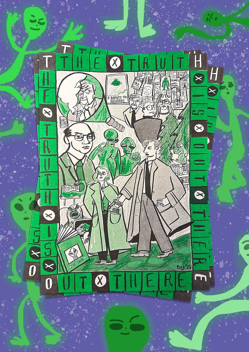 The print is in two colours, a bright, strong, slimey green and black keyline artwork. Beware who you put your trust in but believe, ultimately that you know the Truth is Out There