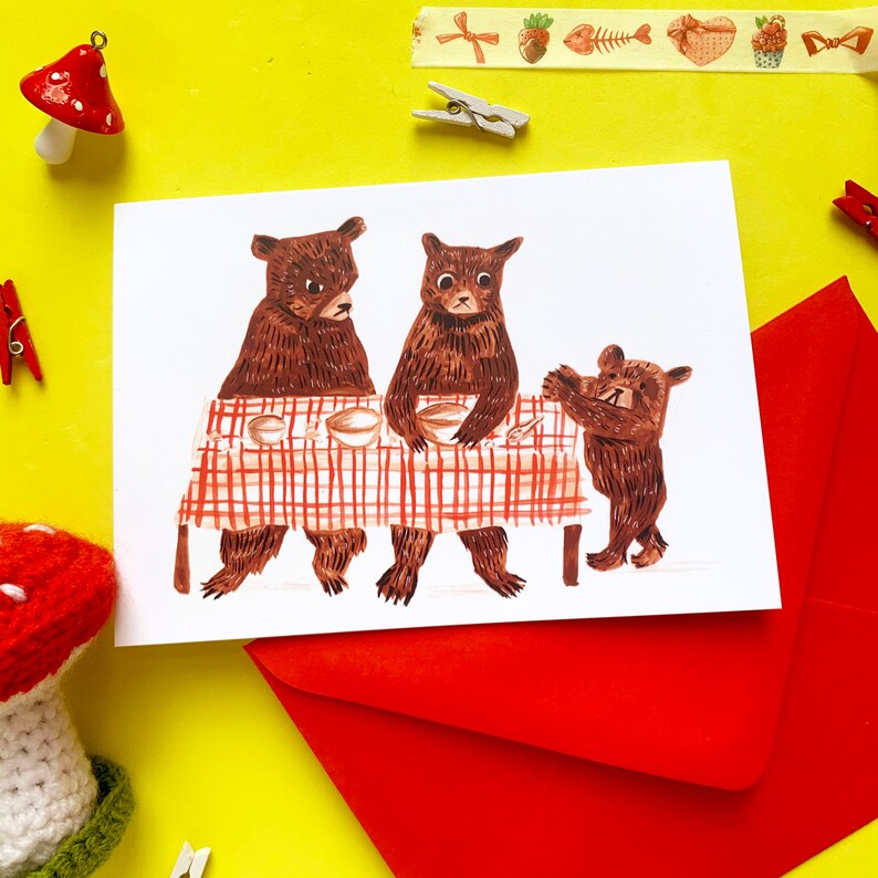 Cute illustrated greeting card, featuring a gouache painting of the three bears.
